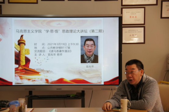 官兆年老师从学习马恩著作的重要性、怎样读马恩经典著作和马恩著作的特点三个方面介绍了自己研读马恩经典著作的经验和感想,强调马恩的每一部著作都值得我们认真阅读,深入思考,把握要义,指导实践。只有原原本本学习和研读马克思主义经典著作,坚持读原著、学原文、悟原理,才能吸收马克思主义的精华,把握马克思主义的要义。官老师的讲座风趣幽默,引经据典,旁征博引,引人入胜,老师们在轻松愉悦的氛围中听得津津有味。官老师对马恩著作研读的分析引起了在座老师的共鸣,为老师们架起了一座通往马恩经典原著的思维桥梁。