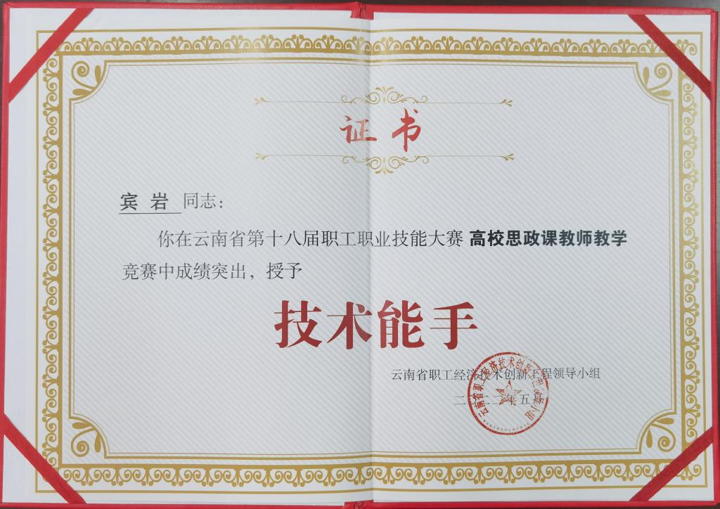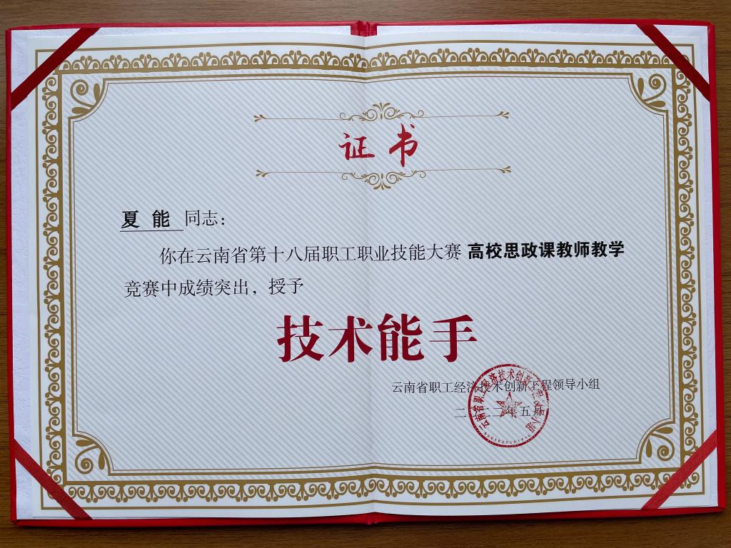今年5月,根据云南省职工经济技术创新工程领导小组“关于授予云南省第十八届职工职业技能大赛优秀选手技术状元和技术能手称号的决定”(云职创〔2022〕1号)文件,公司马院青年教师夏能、宾岩被云南省职工经济技术创新工程领导小组授予云南省第十八届职工职业技能大赛——云南省高校思政课教师教学“技术能手”称号。