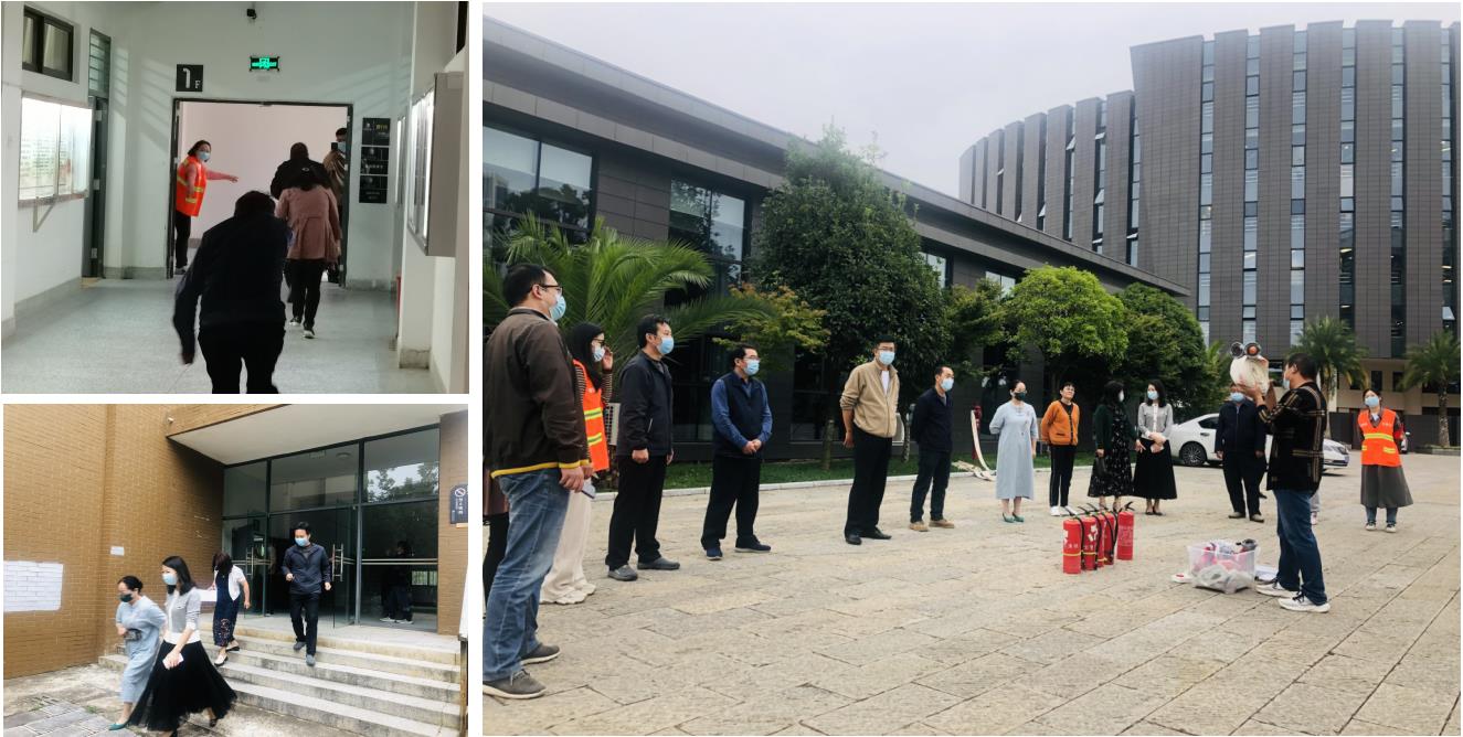 培训结束后,开始了疏散和灭火实战演练。10:30时,随着警报和吹哨响起,三部门负责人及时引导教职工有序撤离公共教学楼B区一楼,疏散到图书馆报告大厅前空地,老师们按照预案规定的疏散路线紧张又有序地撤离。在规定时间内,师生都到达了指定的安全集结地,演练取得了预期效果。